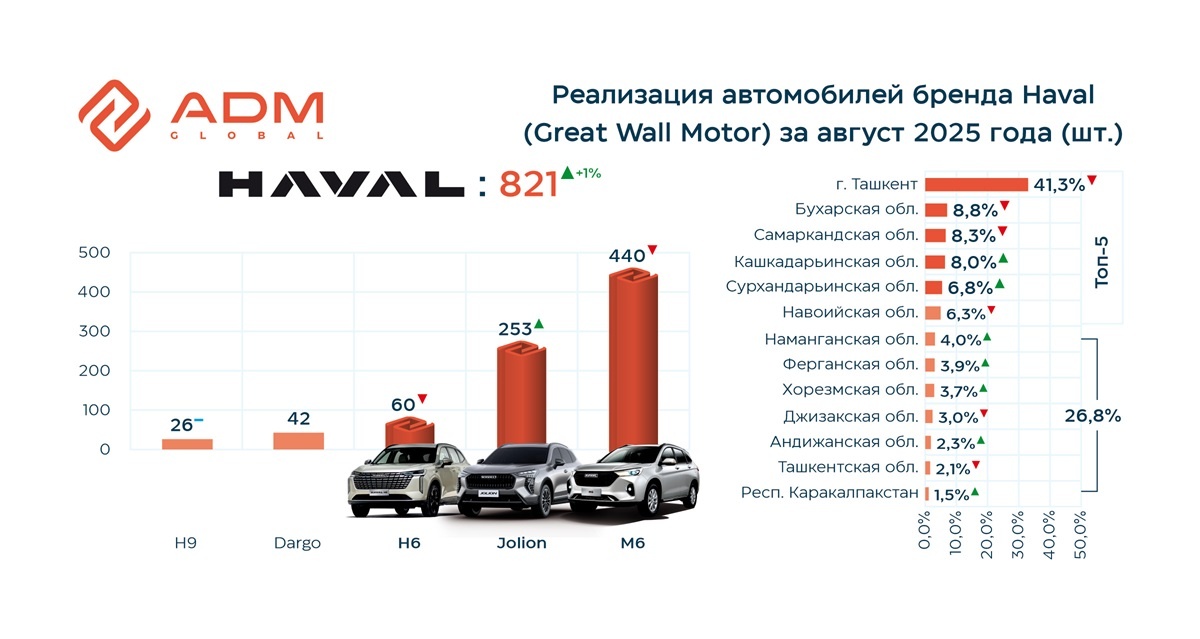 Август 2025 года: итоги реализации автомобилей HAVAL в Узбекистане